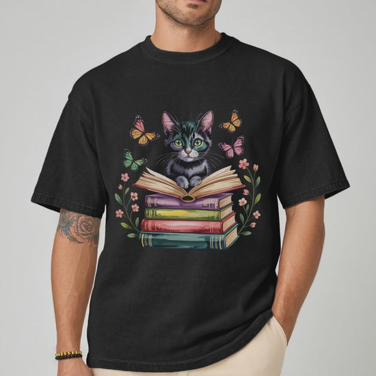 UNISEX CUTE CAT WITH BOOKS TEE FOR BOOKWORMS & CAT MOMS GIFT
